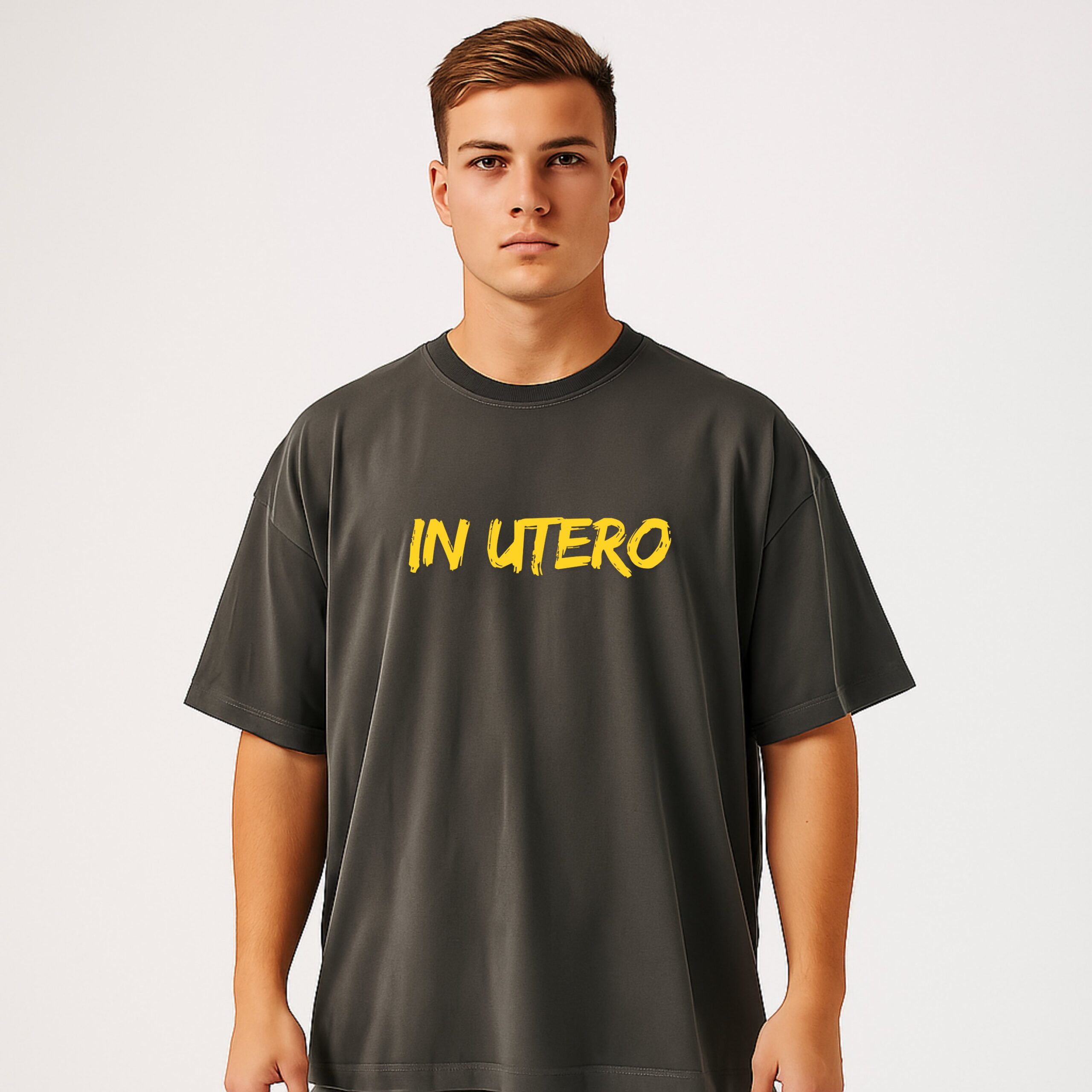 Product Details: Grey oversized T shirt with print on the back which looks rich and attractive.